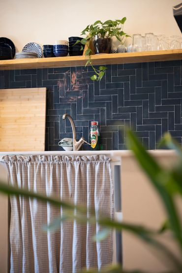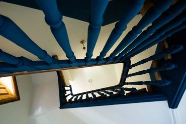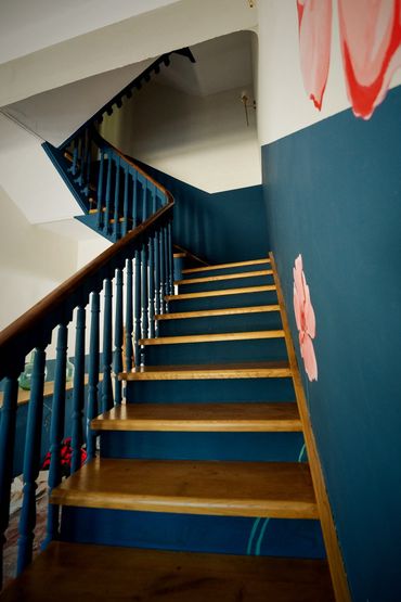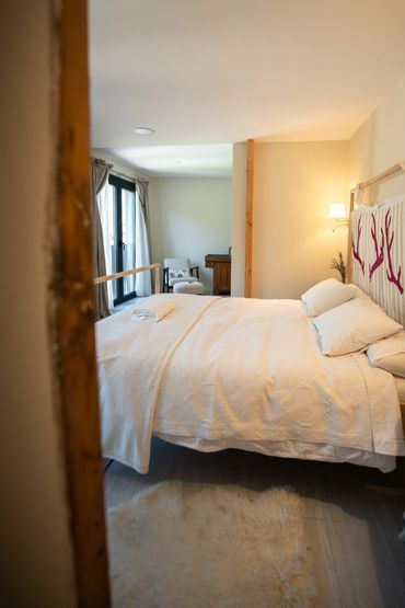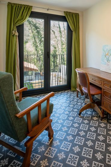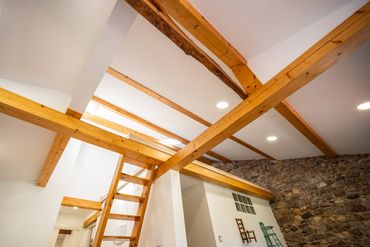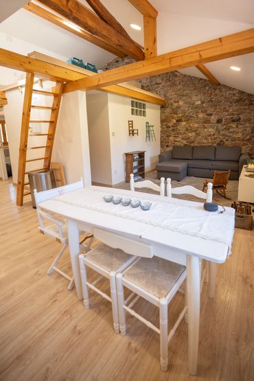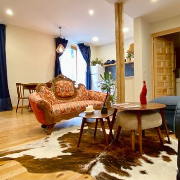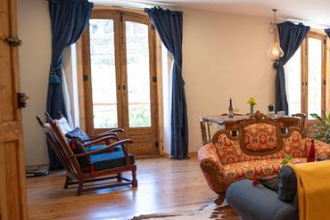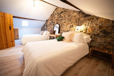 Above it all sits this three bedroom, one bath apartment with original beams and exposed rock walls.